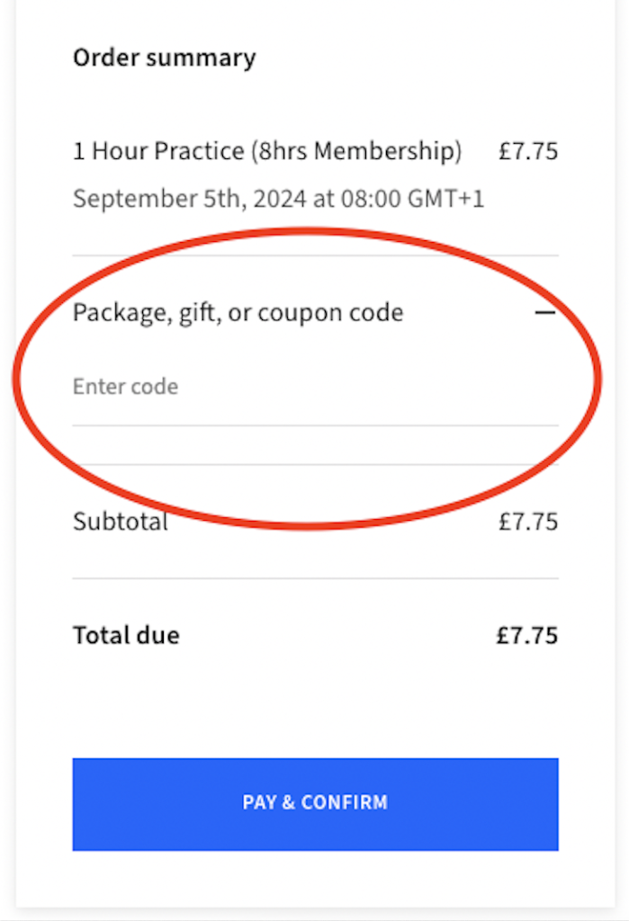 2. On the payment page, you won’t need to enter any card details, scroll down further to the Order Summary section and click on “Package, Gift or Coupon Code” (see screenshot below) and enter your gift package code. You will find this on the original gift order confirmation email – It’s worth writing the code down! Click “Apply” and proceed to finalise the booking by clicking “Confirm”. If you have remaining gift credit you will not be charged anything.